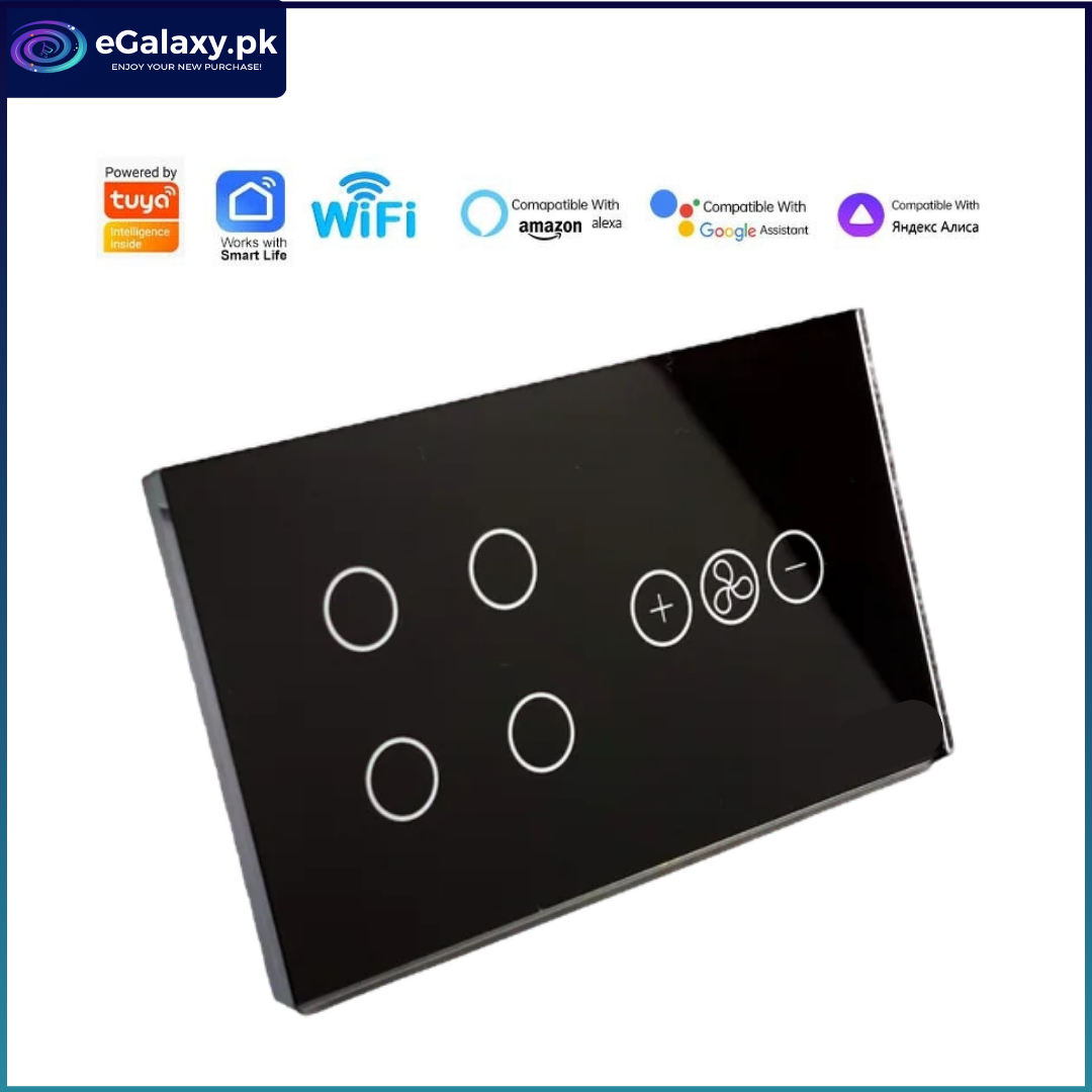 Transform your living space with the 4 Gang Fan Dimmer Switch, a modern smart home essential that brings comfort, style, and control to your fingertips. Designed for those who appreciate both function and elegance, this 4 Gang Fan Dimmer Switch sleek black glass touch panel allows you to manage four separate light circuits and your ceiling fan with effortless precision. Whether you’re relaxing at home, hosting friends, or adjusting the ambience from afar, this smart switch ensures your comfort and convenience are always just a tap or voice command away.