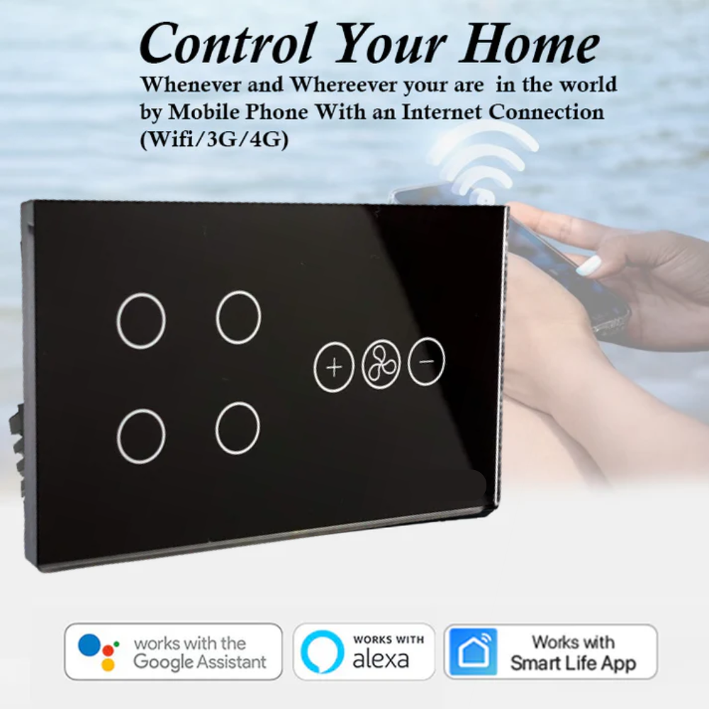 Crafted from premium tempered glass and flame-retardant ABS, the 4 Gang Fan Dimmer Switch not only looks sophisticated but is built to last. Its minimalist design complements any interior — from luxury apartments and smart homes to offices and commercial setups. With built-in WiFi support, the 4 Gang Fan Dimmer Switch connects seamlessly to your 2.4GHz home network, letting you control your lights and fan through the Smart Life or Tuya Smart mobile app. No extra hub or complicated installation required.