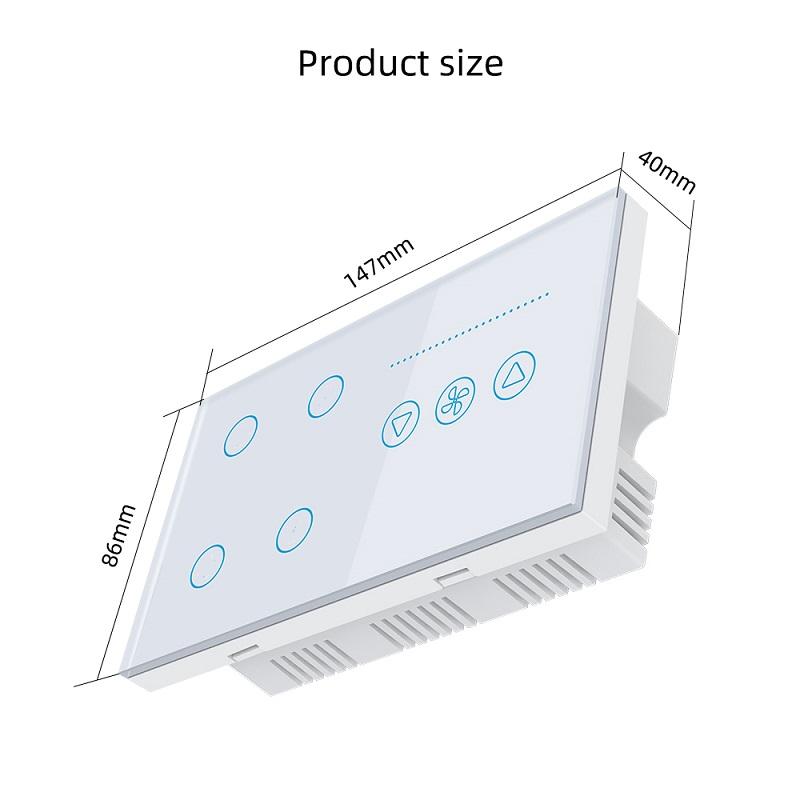 Crafted from premium tempered glass and flame-retardant ABS, the Wifi 4 Gang Fan Dimmer not only looks sophisticated but is built to last. Its minimalist design complements any interior — from luxury apartments and smart homes to offices and commercial setups. With built-in WiFi support, the Wifi 4 Gang Fan Dimmer connects seamlessly to your 2.4GHz home network, letting you control your lights and fan through the Smart Life or Tuya Smart mobile app. No extra hub or complicated installation required.